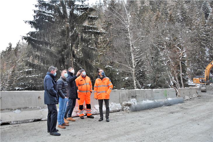 - Bernhard Vieider, BM Stefan Leiter, LR Daniel Alfreider, Patrick Kostner und Marco Losso vom Straßendienst besprechen die letzten Arbeiten vor der Öffnung der Staatsstraße. (Foto: LPA/Angelika Schrott) [JPG 93 KB]