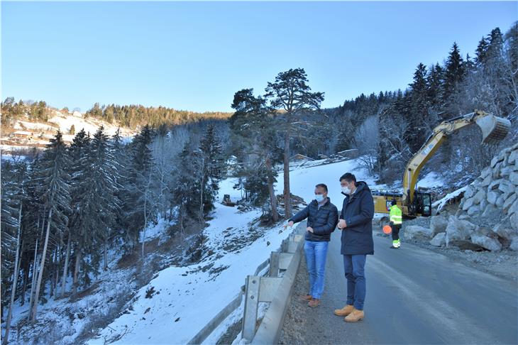 - Die Landesstraße Lajen-St.Peter wurde bergseitig verlegt. BM Stefan Leiter und LR Daniel Alfreider begutachten von dort den nun stabilisierten Hang zwischen Landes- und Staatstraße, der noch begrünt werden soll. (Foto: LPA/Angelika Schrott) [JPG 71 KB]