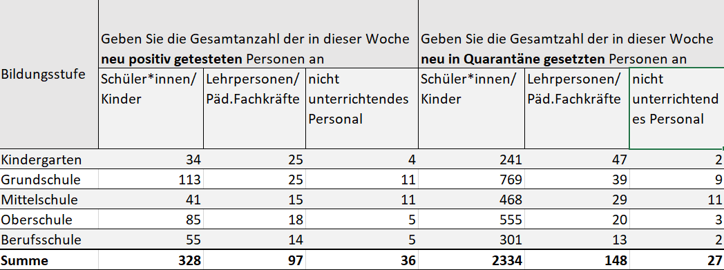 Im Zusammenhang mit den neuen Infektionsfällen mussten an den Kindergärten 290, an den Grundschulen 817, an den Mittelschulen 508, an den Oberschulen 578 und an den Berufsschulen 316 Quarantänen neu verhängt werden.