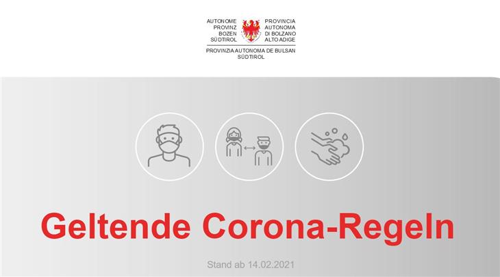 Seit dem heutigen (14. Februar) Sonntag sind in Südtirol verschärfte Regeln zur Eindämmung des Coronavirus in Kraft. Gleichzeitig hat der Staat neue Bestimmungen zur Einreise aus Österreich festgelegt. Bürgerinnen und Bürger finden alle Regeln laufend aktualisiert im Coronavirus-Portal auf der Internetseite des Landes Südtirol. Auch der offizielle Facebook-Kanal des Landes veröffentlicht laufend eine zusammenfassende Übersicht der Regeln.