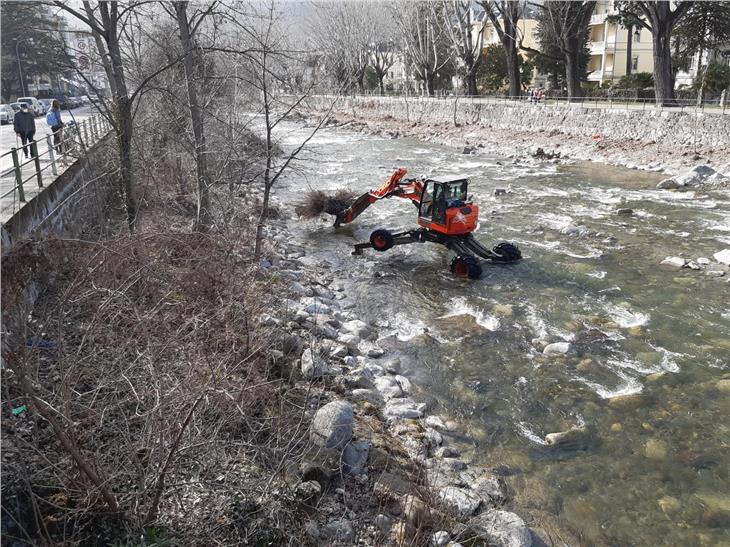 Weitere Arbeiter derselben Baugruppe führen Arbeiten an Bächen im Großraum Meran-Burggrafenamt aus und sind etwa mit Pflege- und Instandhaltungsarbeiten am St.-Peter-Bach und am Gratscher Bach befasst sowie mit dem Aufräumen der Schäden nach den Unwetterereignissen vom Dezember am Melserbach an der Gemeindegrenze zwischen Plaus und Algund. Zudem räumen sie das Geschiebe aus zwei Rückhaltebecken und einem Mündungsbereich an Bächen in den Gemeinden Partschins und Naturns nach den Unwettern vom Dezember, bei denen Material angeschwemmt worden war.