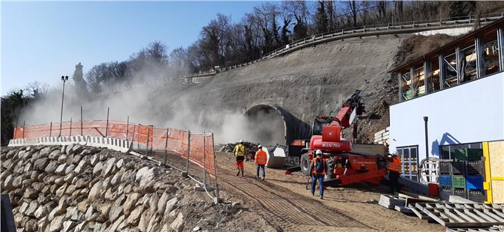 "Jetzt geht es voran und der Tunnel wird in den kommenden Monaten immer mehr Gestalt annehmen", zeigte sich Landesrat Alfreider, der mit den Technikern und Vertretern der Bauunternehmen die nächsten Schritte besprochen hat, zufrieden. Während bisher die aufwändigen Vorbereitungsarbeiten abgewickelt wurden, wird in den nächsten Wochen in der Tat jeden Tag eine Sprengung gemacht und der Tunnel schiebt sich Meter für Meter unter dem Küchlberg vorwärts. "Ein zyklischer Sprengvortrieb", beschreibt es der Verfahrensverantwortliche Johannes Strimmer.  Mit Fortschreiten des Tunnelvortriebes sollen es später zwei Sprengungen pro Tag sein. Gesprengt wird immer zwischen 7 Uhr und 22 Uhr.