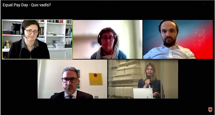 2010 beteiligte sich der Südtiroler Landesbeirat für Chancengleichheit für Frauen erstmals am Aktionstag Equal Pay Day. Erstmals wurde 1966 in den USA darauf aufmerksam gemacht, dass Frauen mehr als ein Jahr arbeiten müssen, um auf dasselbe Jahresgehalt zu kommen wie männliche Kollegen. Auch in Südtirol besteht diese Lohndifferenz – der Gender Pay Gap – fort, weshalb der Landesbeirat angeführt von Präsidentin Ulrike Oberhammer und Vizepräsidentin Donatella Califano gestern Abend (14. April) zu einer Online-Tagung zum Thema "Equal Pay Day – Quo vadis?" lud. 17 Prozent beträgt der Unterschied aktuell in Südtirol, wobei der Privatsektor und der öffentliche Dienst beinahe gleichauf sind. "Der Gap ist groß und ist inakzeptabel", führte der für Chancengleichheit zuständige Landesrat, Landeshauptmann Arno Kompatscher, bei der Tagung aus. Die Lücke sei "ein Beweis von ungerechtfertigter Ungleichheit. Dies müssen wir in unserer Gesellschaft beseitigen", sagte Kompatscher. Zustimmung dafür erhielt der Landeshauptmann sowohl von den Vertreterinnen des Beirates, als auch von den Tagungsreferentinnen Silvia Vogliotti, Christine Zulehner und Landesrat Philipp Achammer.