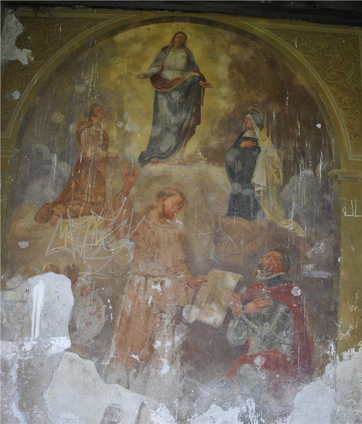 Das Fresko zeigt einen knienden Mann mit Rüstung und rotem Mantel, der dem vor ihm stehenden heiligen Franziskus eine Schriftrolle überreicht. Dargestellt ist Freiherr Engelhard Dietrich von Wolkenstein-Trostburg, der Stifter des Bozner Kapuzinerklosters. Franziskus segnet den Knienden mit seiner Rechten und zeigt zugleich in Richtung Himmel, wo die auf einer Wolke stehenden und von einer Lichtgloriole umfangene Maria Immaculata von den auf Wolken knienden heilige Antonius mit Lilie und heilige Klara mit Monstranz verehrt wird.