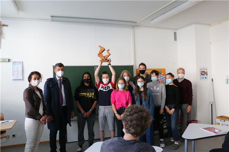 Die Übergabe der Holztrophy an die Klassen 3A der Mittelschule "Ujep Antone Vian" in St. Ulrich, die anstehenden Abschlussprüfungen und die Besonderheiten des Corona-Schuljahres standen im Mittelpunkt der Gespräche mit den Vertretern der Schulen in Gröden, die der ladinische Bildungslandesrat Daniel Alfreider und Schulamtsleiterin Edith Ploner heute (3. Juni) in der Mittelschule in St. Ulrich sowie im Kunstgymnasium und der Landesberufsschule für Kunsthandwerk "Cademia" und der Wirtschaftsfachoberschule "Raetia" führten.
