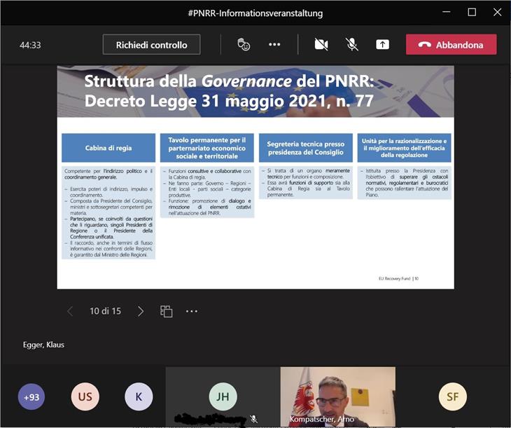 Eine Lagebesprechung zum nationalen Plan für Wiederaufbau und Resilienz (PNRR) hat Arno Kompatscher heute (8. Juli) in einer Videokonferenz mit den Südtiroler Bürgermeistern abgehalten.#