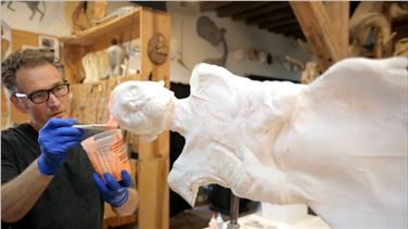Una volta induritosi il pezzo grezzo, la ricostruzione della mummia è stata modellata conformemente all’originale e colorata a mano dal paleo artista Gary Staab, molto noto negli USA, e dal suo team in diversi mesi di lavoro. Staab aveva visionato di persona l’originale in una visita a Bolzano lo scorso autunno. Una sfida l’ha costituita la libera ricostruzione delle mani, non prese in considerazione dalla scansione tomografica computerizzata.