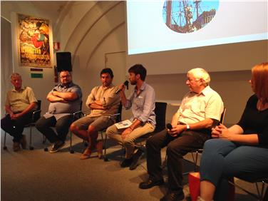 - Inaugurazione mostra "Quando il Garda era un mare" al Centro Trevi a Bolzano (Foto: USP) da sx: Natalino Bernato (Ciné Museum Bolzano), gli autori del filmato Franco Delli Guanti e Ludovico Maillet, il moderatore Matteo Marzano, Martin Kaufmann (Fondatore di Bolzano Cinema) e Marion Wagner (IDM Film Fund & Commission) [JPG 19 KB]