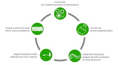 La rinuncia all'impiego di alcuni principi attivi nel trattamento delle piante, una distanza minima dai nuovi impianti, l'attenzione alla situazione eolica in sede di avvio dei trattamenti (forza del vento sotto i due metri aol secondo), l'utilizzo di spuzzatori ad iniezione, da un lato, e la predisposizione di barriere verdi contro la deriva con l'impianto di cespugli.