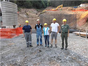 - Hanno preso visione degli interventi di messa in sicurezza in svolgimento sul rio di Montagna (Foto: APC-ufficio bacini montani sud) da sx: il comandante dei vigili del fuoco di Montagna Karlheinz Malojer, l'operaio Kerschbaumer, la sindaca Monika Delvai Hilber, il direttore lavori Prugg, il direttore della stazionee forestale di Egna Robert Franzelin [JPG 32 KB]