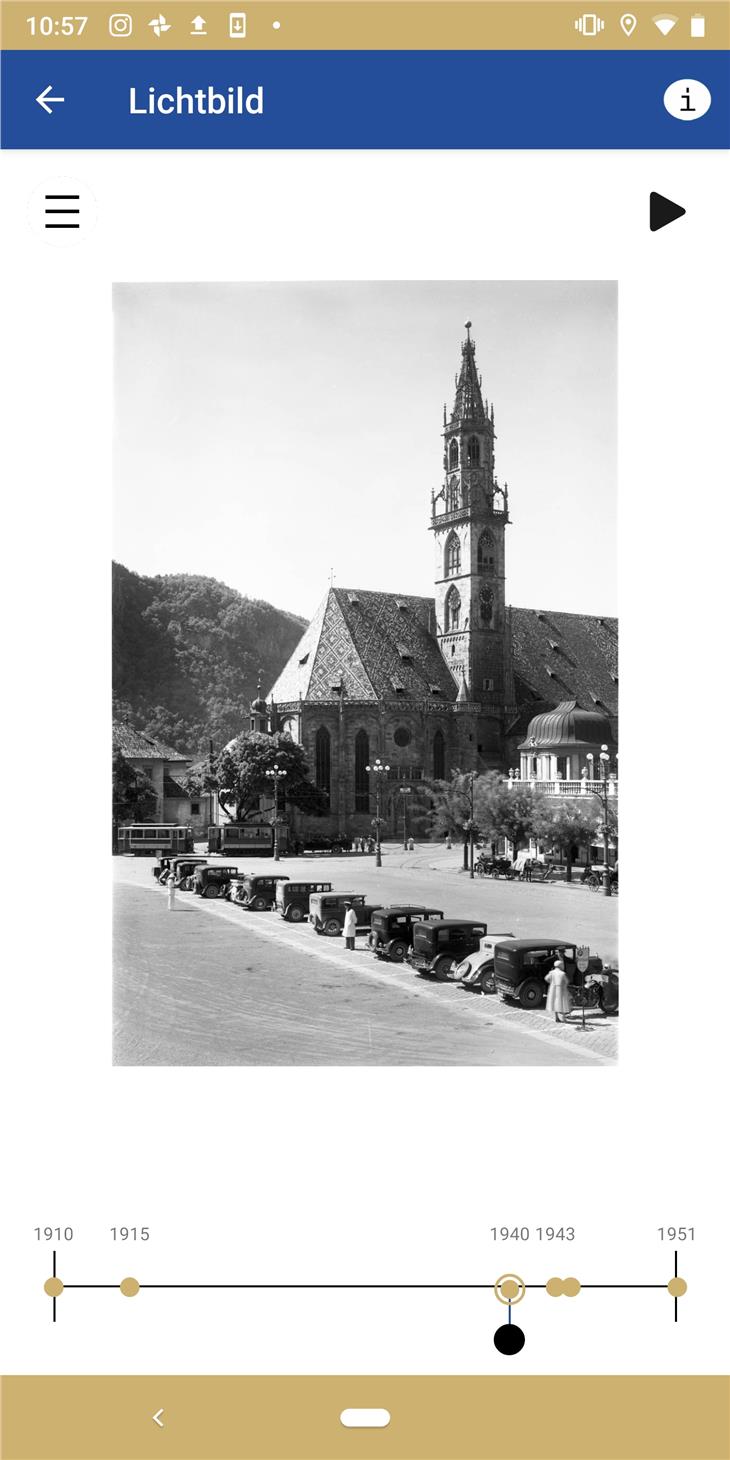 Viaggiare nel tempo attraverso le immagini in alcuni dei luoghi più celebri delle città dell’Alto Adige e del Tirolo. E’ quello che consente di fare Timetrip Pics, la App per Android e iPhone (in italiano, tedesco e inglese) realizzata nell’ambito del progetto Interreg Argento vivo. Navigando con il cellulare si possono quindi scoprire i dettagli della trasformazione di Maria-Theresien-Straße di Innsbruck, di Piazza Walther a Bolzano, dei Bastioni di Brunico o della piazza principale di Lienz. Le immagini del passato sono inserite in riprese odierne girate a 360°. Con la funzione cronologia si può spaziare fra gli scatti del passato andando a scoprire 180 anni di storia della fotografia dell’Alto Adige e del Tirolo. Nei luoghi storici emergono in modo chiaro la storia e la trasformazione degli stessi: bancarelle del mercato, gente a passeggio, dimostrazioni politiche, parate, ingorghi stradali e zone pedonali.