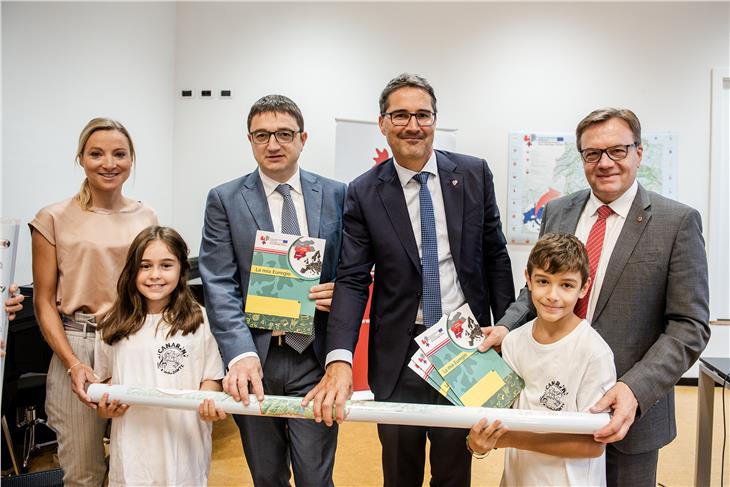 Approfondire la conoscenza dell'Euregio Tirolo-Alto Adige-Trentino e rafforzare l'interesse di bambini e ragazzi verso le regioni confinanti con una storia in comune. Questo l'obiettivo che si vuole raggiungere con la nuova cartina geografica dell'Euregio, i cui primi esemplari sono stati consegnati questa mattina (25 settembre) dai presidenti Arno Kompatscher, Günther Platter e Maurizio Fugatti ai ragazzi di due scuole di Bolzano: la scuola media "Josef Aufschnaiter" e la scuola elementare "Dante Alighieri". Il progetto è stato coordinato dalle Sovrintendenze scolastiche italiana e tedesca, dall'Ufficio programmazione e organizzazione del Trentino e dalla Bildungsdirektion del Tirolo.