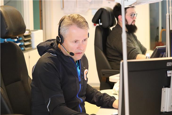 Centro emergenze: in piedi Schuler (sx), il presidente Gapp, davanti (da sx) Gallmetzer, Vischi (reperibilità), Tartarotti (servizio meteo), Gheser (servizio valanghe), Lazzarotto (vigili del fuoco), Kaufmann (Vvff) (Foto ASP/Maja Clara)