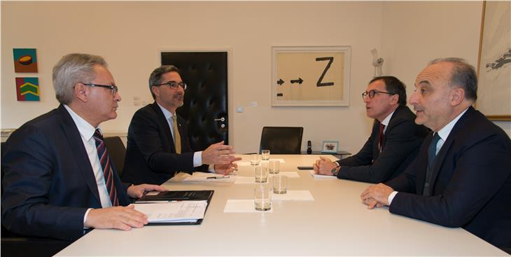 - Il tavolo di lavoro: da sinistra il segretario generale della Provincia Eros Magnago, il presidente Kompatscher, il ministro Boccia e Antonino Ilacqua, consulente del Ministero e presidente della Commissione dei Sei (foto ASP/Peter Daldos) [JPG 30 KB]