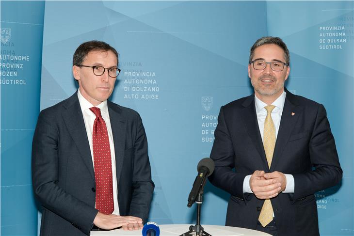 - Il ministro Boccia (sx) e il presidente Kompatscher (dx) durante lo statement ufficiale con i media (foto ASP/Peter Daldos) [JPG 40 KB]