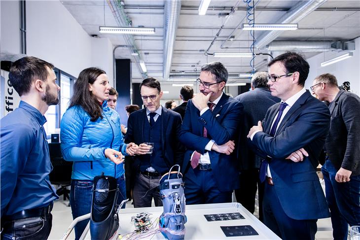 - I collaboratori della ditta Salewa Marilena Kurz e Matteo Dalvit illustrano al presidente Kompatscher (secondo da dx) e al direttore Zingerle lo scarpone dotato di sensori elaborato al Maker Space del NOI Techpark (foto ASP/Claudia Corrent) [JPG 74 KB]