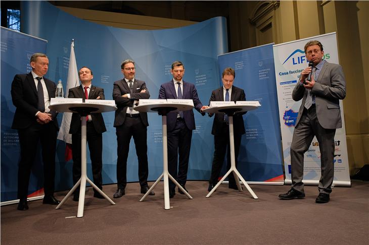 - Il progetto illustrato in conferenza stampa: da sx Costa, Vettorato, Kompatscher, Alfreider, Crespi e Klauser. (Foto: Oliver Oppitz) [JPG 52 KB]