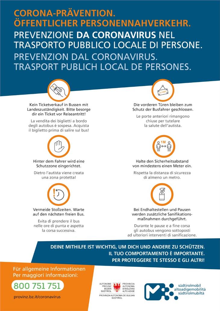 Come previsto dal recente decreto del presidente del Consiglio dei ministri Giuseppe Conte, le linee di trasporto pubblico sono attualmente garantite su tutto il territorio. "Per garantire i servizi di base nei settori della sanità e della protezione civile, nonché l'approvvigionamento di generi alimentari e medicinali, è importante garantire alle persone che lavorano in questi settori un mezzo di trasporto per andare al lavoro e tornare a casa", afferma l'assessore provinciale alla mobilità Daniel Alfreider. L’assessore sottolinea che in questi giorni i trasporti pubblici non dovrebbero in nessun caso essere utilizzati per il tempo libero. Specialmente gli anziani e i bambini non dovrebbero utilizzare i mezzi pubblici.