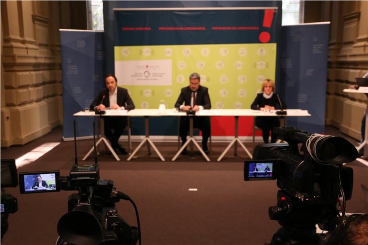 La conferenza stampa virtuale della Provincia oggi: da sx Achammer, Kompatscher, Deeg. (Foto: ASP/Fabio Brucculeri)