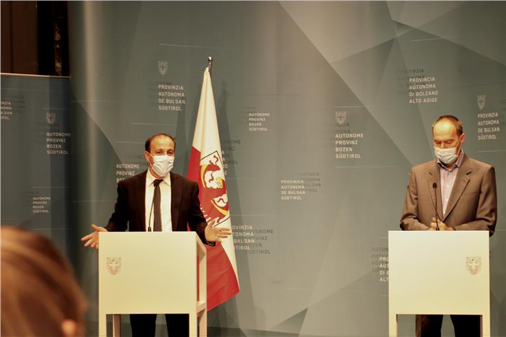 - L'assessore Vettorato (a sx) e il direttore del Laboratorio analisi aria e radioprotezione, Verdi, hanno presentato gli esiti dello studio sulla qualità dell’aria indossando una protezione naso-bocca. (Foto: ASP/Thomas Laconi) [JPG 33 KB]