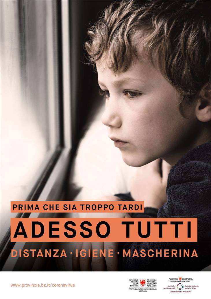 Il Covid-19, la malattia causata dal coronavirus, è attualmente il pericolo maggiore per la società: la Provincia di Bolzano ne è convinta e non si affida solo a misure preventive ma anche alla campagna di sensibilizzazione "Adesso tutti". Partita il 22 ottobre scorso con affissioni in luoghi pubblici e pubblicità su carta stampata e online, la campagna è suddivisa in tre fasi.