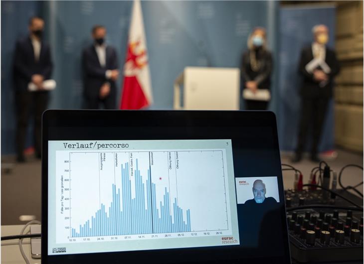 Il biostatistico dell’Eurac Markus Falk ha mostrato l’andamento epidemiologico con dei grafici. "Mentre all'inizio di ottobre il numero di casi è aumentato gradualmente, le prime misure introdotte ai primi di novembre e poi i test di massa hanno portato a un rapido calo del numero di casi", ha riferito Falk. Sarebbe bello se il numero di casi diminuisse ulteriormente e si stabilizzasse a un livello molto basso, ha aggiunto il biostatistico.