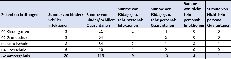 Nelle scuole dell'infanzia sono stati registrati 5 casi di positività al Covid-19, nelle scuole primarie (scuole elementari) vi sono stati 7 casi di positività al Covid-19, nelle scuole medie sono stati registrati 13 casi (8 tra i ragazzi), mentre vi sono stati 7 casi (6 fra i ragazzi) nelle scuole secondarie di secondo grado (scuole superiori), compresa la formazione professionale.