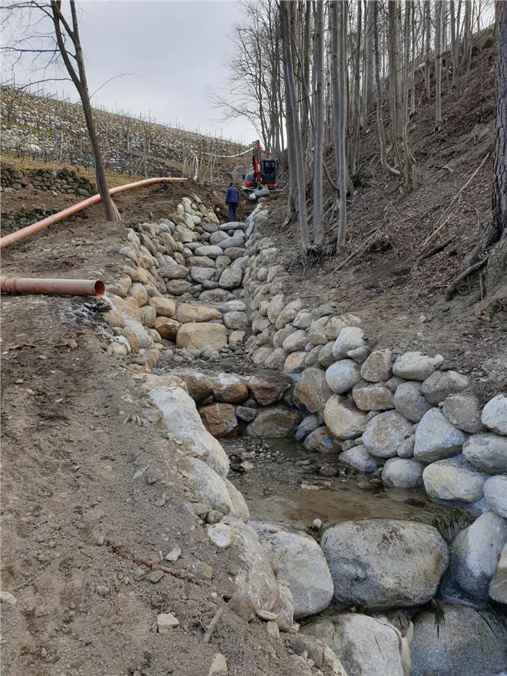 Secondo il responsabile del progetto, Philipp Walder, si tratta di "un intervento resosi necessario alla luce dell'intensificarsi delle precipitazioni degli ultimi anni, che avevano portato notevoli quantitativi di acqua a defluire nella sorgente". Le opere di protezione delle sponde sono state realizzate utilizzando granito e muri a secco, al fine di mitigare l'impatto con il paesaggio circostante. La difficoltà principale nell'esecuzione dei lavori è stata legata alla carenza di spazio: il trasporto del materiale, in una zona quasi inaccessibile per i mezzi pesanti, è stato in parte eseguito con l'utilizzo di veicoli cingolati.