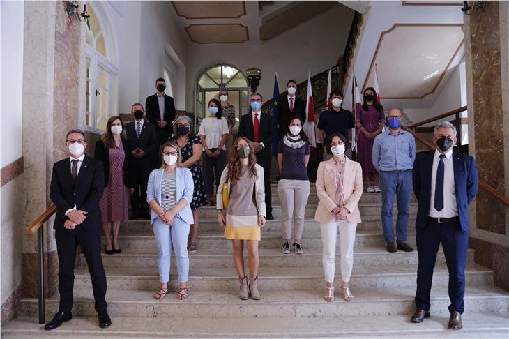 Formare e aggiornare personale della pubblica amministrazione già in possesso di un’elevata qualificazione, rafforzare lo scambio fra le istituzioni dell’Euregio Tirolo-Alto Adige-Trentino.  Questo l’obiettivo del Master Euregio in pubblica amministrazione lanciato nel 2018 dal GECT Euregio in collaborazione con le Università di Innsbruck, Trento e Bolzano. I primi 36 partecipanti al master hanno concluso le 1.500 ore di corso, per un totale di 60 crediti formativi, sostenendo a fine 2020 l’esame conclusivo. Undici di essi sono altoatesini, e nel corso di una cerimonia svoltasi oggi (11 giugno) a Palazzo Widmann hanno ricevuto i loro diplomi dal presidente della Provincia, Arno Kompatscher, dalla vice-rettrice dell’Università di Bolzano, Stefania Baroncelli, dal direttore generale della Provincia, Alexander Steiner, e dal direttore dell’Ufficio comune dell’Euregio, Christoph von Ach.