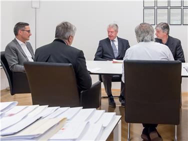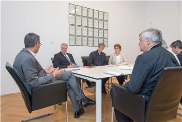 Una delegazione della nuova giunta comunale di Bolzano è stata ricevuta questa mattina (22 luglio) dal presidente della Provincia Arno Kompatscher. Si è trattato del primo incontro ufficiale dopo l'elezione del sindaco Renzo Caramaschi, il quale era accompagnato dagli assessori Sandro Repetto e Maria Laura Lorenzini, mentre per quanto riguarda l'amministrazione di Palazzo Widmann erano presenti anche l'assessore ai lavori pubblici Florian Mussner, il segretario generale Eros Magnago e il direttore della Ripartizione edilizia e servizio tecnico, Andrea Sega. Tanti i temi affrontati durante il vertice, durato all'incirca due ore, a partire dal dicusso progetto riguardante la nuova funivia di San Genesio. "Abbiamo valutato attentamente la situazione dal punto di vista tecnico e politico - spiega il presidente Kompatscher - e abbiamo deciso di non dare continuità all'idea di prolungare l'impianto sino al centro città attraversando la zona del Talvera. Un gruppo misto, formato da esponenti provinciali e comunali, sarà chiamato a sviluppare soluzioni alternative, in ogni caso il collegamento tra la stazione a valle e il centro città dovrà essere migliorato".