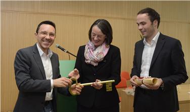 - La consegna ufficiale del nuovo complesso, con chiavi e licenza d'uso, alla direttrice dell’ITE “Kunter”, Barbara Pobitzer (al centro) a cura degli assessori provinciali Tommasini (a sx ) Achammer (a dx) il 22 marzo (Foto: USP) [JPG 14 KB]