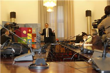 - Il colloquio con i media pr illustrare i vari capitoli del bilancio (con l'immagine del cubo colorato) (Foto rm) [JPG 19 KB]